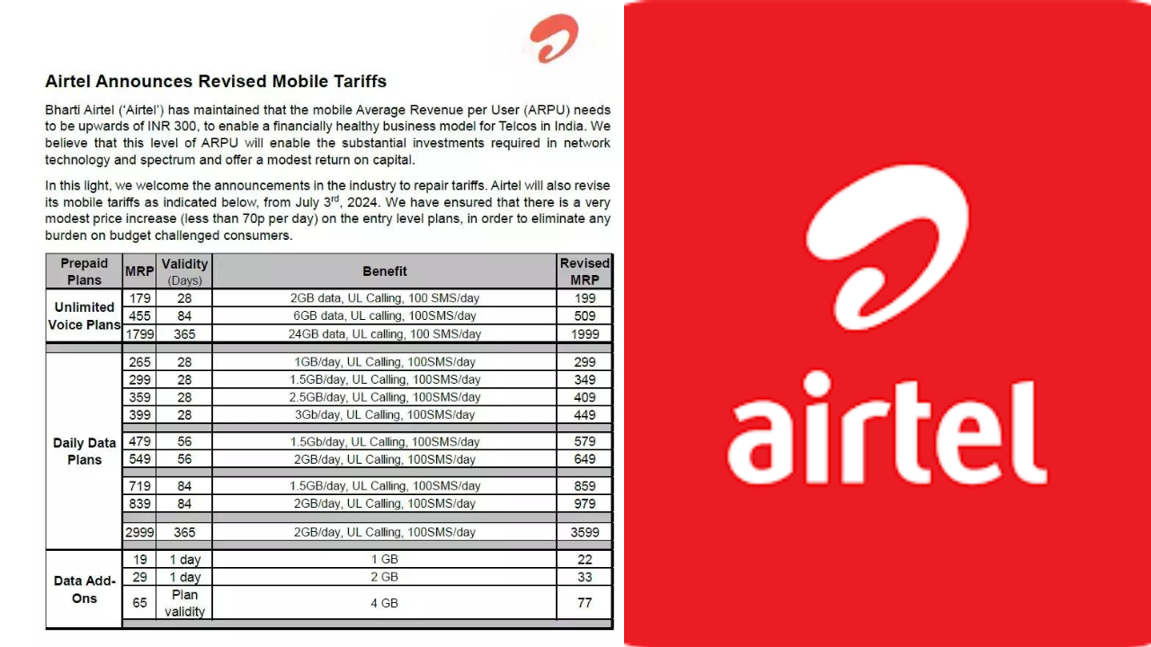 2 GB டேட்டா உடன் 28 நாளுக்கான ஏர்டெல் கட்டணம் ரூ.179இல் இருந்து ரூ.199 ஆகவும், 6GB டேட்டா உடன் 84 நாளுக்கான கட்டணம் ரூ.455இல் இருந்து ரூ.509 ஆகவும் உயர்த்தப்பட்டுள்ளது.